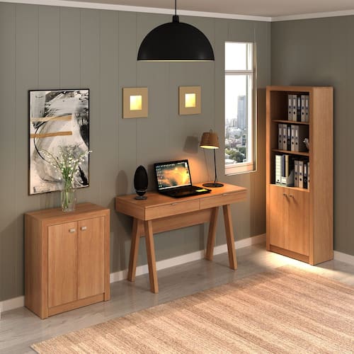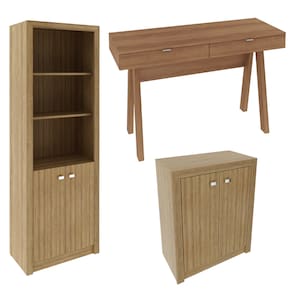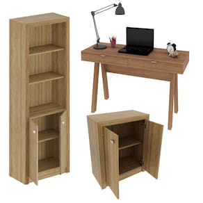 CARACTERÍSTICAS TÉCNICAS: - Produzido em MDP. - Acabamento em BP na cor Amêndoa. - Mesa Escrivaninha Cavalete (ME4128): 2 gavetas com puxadores em aluminio escovado. - Armário Balcão de Escritório (ME4103): 2 portas para otimizar o espaço. - Armário de Escritório (ME4110): 2 portas e 5 prateleiras internas para organização.