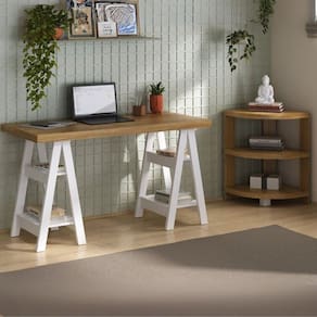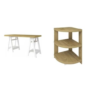 Este lindo conjunto para Home Office ou escritório combina leveza, elegância e funcionalidade em um design que valoriza cada detalhe. A escrivaninha com base em cavaletes oferece um visual moderno e despojado, com prateleiras laterais que garantem praticidade e espaço para organizar livros e objetos de uso diário. A estante baixa de canto complementa o conjunto com harmonia, aproveitando o ambiente de forma inteligente e adicionando um toque de sofisticação. Com acabamento amadeirado e branco e estrutura de alta qualidade, o conjunto une beleza, resistência e estilo, tornando o espaço de trabalho ou estudo muito mais agradável e inspirador. Acabamento: BP Altura do Conjunto: 75 cm Ambiente: null Ambiente Principal: Escritório Cor: Olmo/Branco Informação Complementar: 1x Estante de Canto Multifuncional com 3 Prateleiras Wind Olmo Largura: 49 cm Altura: 72 cm Peso: 15,5 kg Profundidade: 49 cm Necessita Montagem: Sim