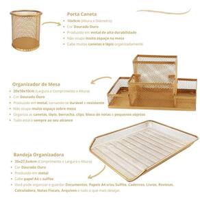 O kit é composto por três peças: uma bandeja organizadora simples dourada, um organizador de mesa com 4 partições dourado e um porta caneta dourado. Feitos em metal de alta qualidade, esses organizadores são duráveis e resistentes.