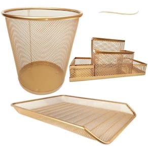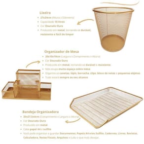Kit escritório lixeira, organizador de mesa, bandeja organizadora dourado Kit escritório dourado Para quem gosta de ter tudo sempre à mão, com agilidade e praticidade. Kit de organizadores de escritório é ideal para você.Com eles, você vai evitar a perda de tempo procurando os itens de que precisa e que usa com frequência. Tudo estará a sua mão. Kit organizadores de escritório preto composto por:- 01 lixeira aramada dourado 10l- 01 bandeja organizadora simples dourado- 01 organizador de mesa com 4 partições dourado Cor: dourado ouroMaterial: metal Tamanhos:- lixeira tamanho: 27x23,5x18,5cm altura x diâmetro da boca x diâmetro da base - bandeja organizadora de mesa tamanho: 4x27,5x35cm altura x largura x comprimento - organizador de mesa com 4 partições dourado tamanho: 20x10x10cm largura x comprimento x altura Marca: Markys Store