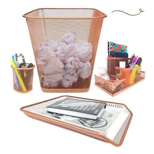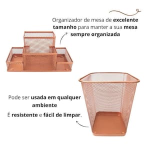 Kit organizadores de escritório rose gold composto por: - 01 lixeira aramada retangular 12l - 01 bandeja organizadora simples rose gold - 01 organizador de mesa com 4 partições rose gold - 01 porta caneta rose gold