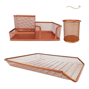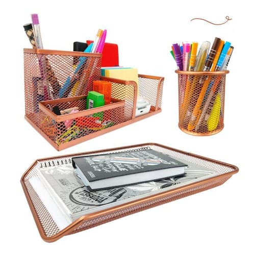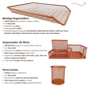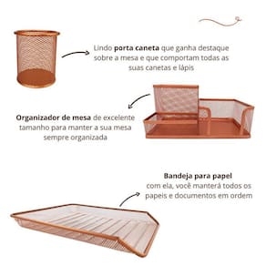 Kit escritório porta caneta, organizador de mesa, bandeja organizadora rose gold Kit escritório rose gold Para quem gosta de ter tudo sempre à mão, com agilidade e praticidade. Kit de organizadores de escritório é ideal para você.Com eles, você vai evitar a perda de tempo procurando os itens de que precisa e que usa com frequência. Tudo estará a sua mão. Kit organizadores de escritório rose gold composto por:- 01 bandeja organizadora simples rose gold- 01 organizador de mesa com 3 partições rose gold- 01 porta caneta rose gold Cor: rose goldMaterial: metal Tamanhos:- porta caneta tamanho: 10x9cm altura x diâmetro - bandeja organizadora de mesa tamanho: 4x27,5x35cm altura x largura x comprimento - organizador de mesa com 3 partições tamanho: 20x10x10cm largura x comprimento x altura Marca: Markys Store