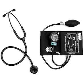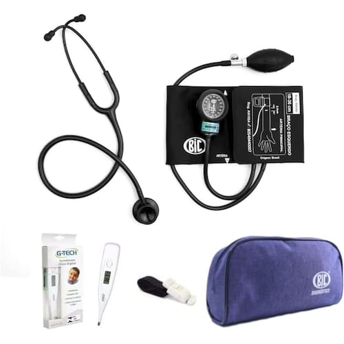 Kit Aparelho de Pressão Esfigmomanômetro Nylon Fecho Contato + Estetoscópio Duplo Bic + Termometro Axilar Digital + Garrote Itens Inclusos: 01 Esfigmomanometro BIC 01 Manômetro 01 Braçadeira 18-36cm 01 Válvula de Deflação 01 Pera 01 Estojo 01 Estetoscópio Duplo 01 Termometro Axilar 01 Garrote 01 Manual de Instruções. Conjunto Esfigmomanômetro + Estetoscópio Duplo Adulto e Infantil BIC. APARELHO DE PRESSÃO FECHO DE CONTATO ADULTO NYLON BIC -Aparelho de pressão arterial; -Alta precisão e sensibilidade; -Nova válvula para perfeita retenção de ar durante a medição; -Diagnóstico seguro e confiável; -Manguito e pera em PVC antialérgico e de alta durabilidade; -Com braçadeira de NYLON antialérgico e impermeável; -Fecho de Contato; -Testado rigorosamente pelo Controle de Qualidade do Inmetro; -Certificado pela ANVISA - Registro MS 80540449001; -Aferido pelo Inmetro e 100% com selo de verificação inicial; -Acompanha uma linda bolsa exclusiva. Especificações Técnicas: Tamanho: Adulto; Dimensões: Comprimento: 52cm; Largura: 14cm; Circunferência: 18 a 36 cm. Fabricante: BIC; Registro MS: 80540449001; Garantia: 3 anos contra defeitos de fabricação. ESTETOSCÓPIO Adulto e Infantil BIC O Estetoscópio Duplo com ngulo de Alumínio da BIC é um aparelho utilizado para amplificar sons corporais, como os sons cardíacos e os sons pulmonares. Duo-sonic (Duplo): auscultador dupla função, metal cromado de alta durabilidade com anel de metal cromado para sistema de trava do diafragma em PVC atóxico, com excelente sensibilidade para ausculta cardíaca. Com sino e anel de PVC atóxico para ausculta pulmonar. Modelo: Adulto e Infantil Olivas: Formato anatômico em PVC macio e atóxico. Tubo PVC: Tubo duplo em PVC macio, flexível e atóxico para ausculta mais precisa. Registro no Ministério da Saúde: 80001930003. Garantia: 3 anos contra defeitos de fabricação. Nossos produtos atendem aos mais exigentes consumidores na área da saúde, sendo eles médicos, enfermeiros, profissionais de saúde, estudantes e consumidores finais.