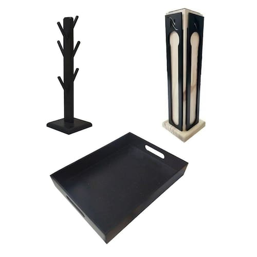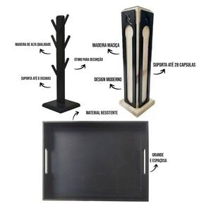 Kit espaço café bandeja porta cápsula nespresso porta xicara Porta cápsula vazado a laser nespresso. O nosso porta cápsulas, guarda com segurança e deixa organizado prendendo bem a cápsula sem deixar cair produto bem desenvolvido com muito charme e tons modernos para deixar o ambiente mais bonito Esse porta cápsulas tem ar moderno que mescla os tons e veio da madeira de pinus com o local em preto aonde é encaixado as cápsulas sendo assim um da destaque ao outro organize seu canto do café com as cápsulas sempre a mão e ainda decore o seu ambiente com certeza vai ser uma peça que vai chamar a atenção e tirar elogios Feito em pinus de reflorestamento natural e de mdf com pintura em preto (tinta acrílica)Comporta 28 capsulas nespressoMedidas 32x10x10 O pinus é natural, não leva verniz e nem seladora. Por se tratar de madeira natural deve haver variações na tonalidade e apresentar veios da madeira em locais distintos. Suporte porta xícara caneca em mdf 6 pinos xicaras: Esse é o produto ideal para decorar o seu tão especial cantinho do café ou até mesmo presentear uma pessoa querida, além da beleza o porta xicaras é feito em mdf que é muito resistente, ideal até 6 xicaras/canecas de 240ml. Com esse porta xicaras você vai conseguir deixar seus armarios muito mais organizados. Medidas suporte:Altura: 36 cmBase: 11x11Peso: 282gMaterial de composição: mdf Bandeja para café decoração 40x30 grande preta madeira mdf: Feita em mdf de 6mm com pintura em tinta acrílica na cor preta ela é ideal para organizar o seu lar, servir um cafézinho para os amigos, organizar papeis de escritório entre diversas outras utilidades. Além de organizar, ela serve para deixar o ambiente mais bonito decorando muito bem Bandeja versátil, barata e de qualidade, combinando com todos os ambientes no qual estiver Suas medias são40x30x6 (externa)38,5 x 28,5 x 5,5 (na parte interna) Possui as laterais vazadas como uma alça. Obs: xícaras das imagens não inclusas Marca: Dupétriz