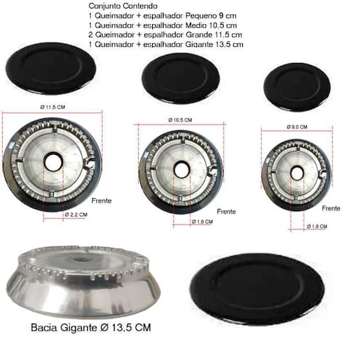 - 1 espalhadores pequeno - 7,5 cm de diâmetro - 1 queimadores pequeno - 9,0 cm de diâmetro - 1 espalhador médio - 8,5 cm de diâmetro - 1 queimador médio - 10,0 cm de diâmetro - 2 espalhador grande - 10,0 cm de diâmetro - 2 queimador grande - 11,5 cm de diâmetro - 1 espalhador gigante - 11,6 cm de diâmetro - 1 queimador gigante - 13,5 cm de diâmetro