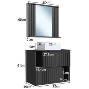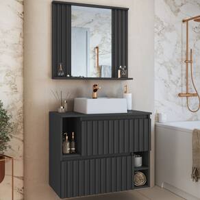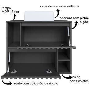 Características adicionais: Acompanha espelho e prateleira, peças ripadas aplicadas no painel, cuba em mármore sintético, balcão com 2 portas com abertura com pistão a gás, 3 nichos externos, dobradiças metálicas