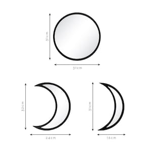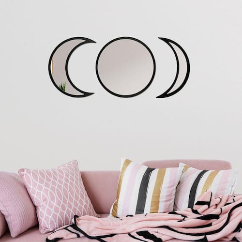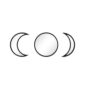 Se você gosta de decoração com itens minimalistas este espelho é uma ótima opção, pois é composto por três espelhos separados que remetem às fases da lua: cheia, minguante e crescente. Com moldura feita de madeira MDF na cor Preta, quando instalados em conjunto dão um toque de muita elegância, modernidade e personalidade à decoração do ambiente.