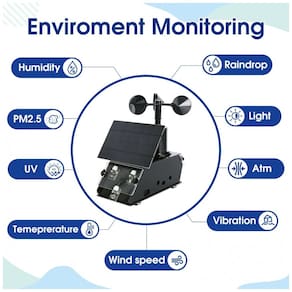 Sensores inclusos (8 sensores, 9 parâmetros): Sensor de temperatura e umidade (DHT), sensor de pressão atmosférica, anemômetro (velocidade do vento), sensor de chuva, sensor de luz, sensor UV, sensor PM2,5, sensor de vibração