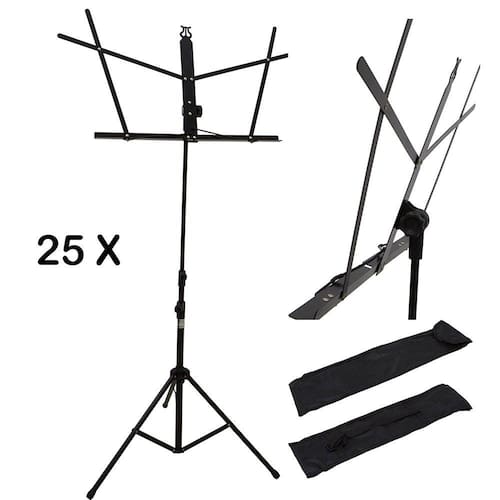 Kit com 25 estantes de partitura dobrável com regulagem de altura de 3 estágios. De instalação simples e com sistema de fixação das folhas a estante S1 possui acabamento em epoxi, é compacta e fácil de manusear além de ser resistente, acompanha bag para facilitar o transporte.Especificações- Marca: New York- Modelo: S1- Cor: Preta- Tipo: Estante de partitura tubular- Diâmetros: 16 mm, 12,5 mm e 9,5 mm- Altura máxima: 102 cm- Altura mínima: 52 cm- Tamanho dobrado: 55 cm- Peso Aprox.: 0,750 kgConteúdo da Embalagem- 25 Estantes Para Partitura S1 New York- 25 Bags- Dimensões da Embalagem (AxLxP): 24 x 33 x 58 cm*Imagens meramente Ilustrativas
