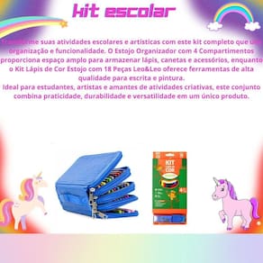 Transforme suas atividades escolares e artísticas com este kit completo que une organização e funcionalidade. O Estojo Organizador com 4 Compartimentos proporciona espaço amplo para armazenar lápis, canetas e acessórios, enquanto o Kit Lápis de Cor Estojo com 18 Peças Leo&Leo oferece ferramentas de alta qualidade para escrita e pintura.