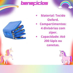 Benefícios Organização Prática: Estojo com 4 compartimentos amplos que armazenam até 200 lápis ou canetas. Versatilidade: Inclui lápis de cor vibrantes e lápis grafite para diversas atividades. Alta Durabilidade: Estojo em tecido Oxford resistente e lápis com mina reforçada. Conforto no Uso: Design ergonômico dos lápis e alça de do estojo. Praticidade Completa: Acessórios como apontador e borracha garantem eficiência no dia a dia.Características do EstojoMaterial: Tecido Oxford de alta qualidade com costura reforçada.Compartimentos: 4 divisórias independentes para melhor organização.Capacidade: Armazena até 200 lápis ou ões: 20 cm x 12,5 cm x 9 Moderno: Disponível em cores neutras e estilosas.Características do Kit Lápis de CorLápis de Cor: 12 unidades com formato sextavado e mina de 2,2 mm macia e ápis Grafite: 4 unidades HB para órios:1 apontador com depó borracha com cinta para maior precisãção de Cores: Apontador e borracha com .Especificações TécnicasEstojo Organizador:Material: Tecido Oxford.Compartimentos: 4 divisórias com zíper.Capacidade: Até 200 lápis ou Lápis de Cor:Lápis de cor: 12 cores ápis grafite: 4 dos lápis: 2,2 údo da Embalagem1 Estojo Organizador com 4 lápis de cor lápis grafite apontador com depó borracha com cinta.