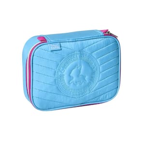 O estojo da Luluca é confeccionado em material soft com matelassê, possui puxadores personalizados e comporta 36 lápis nos elásticos.