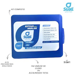 O Kit Estojo Para Teste/Análise 3 em 1 da Suall é a solução ideal para manter a qualidade da água da sua piscina. Com medidores e reagentes para análise de cloro, pH e alcalinidade total, este kit garante resultados precisos e rápidos, facilitando a manutenção. O uso regular permite ajustar o tratamento da água, proporcionando conforto e segurança aos banhistas. Indicado para piscinas residenciais e comerciais, o kit acompanha um estojo resistente para armazenamento e transporte.