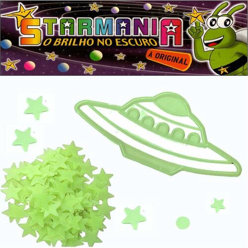 Produto , revendedor autorizado kit star mania com 103 peças que brilham no escuro. Acompanha fita dupla face para fixação das peças. Fabricação em plástico polipropileno pigmentado fosforescente. Composição do kit: - 100 estrelinhas com 36 milímetros; - 1 mini planetinha 30 milímetros; - 1 mini estrelinha 25 milímetros; - 1 disco voador 250 milímetros; - aprox. 103 fitas dupla face para fixação. Com mais de 20 anos de mercado e mais de 20 milhões de peças produzidas, a star mania traz a você um produto de excelente qualidade para decoração de ambientes. O kit da star mania é composto por diversas peças exclusivas para decoração do seu quarto. No processo de fabricação, é utilizado o plástico de polipropileno na produção das peças com pigmentação importada diretamente da europa, garantindo à você um produto de com uma qualidade exclusiva. Possuímos diversos modelos, consulte nossa linha de produtos da marca star mania em nossos demais anúncios. Este produto é um produto da marca star mania, a marca registrada inpi nº 821858661 . Marca: Starmania