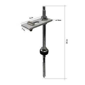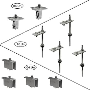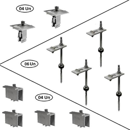 Composição do kit completo: Suporte fabricado em alumínio e aço inox para fixação em vigas de madeira Este suporte de fixação permite ótimo custo x benefício, pois é fixado na estrutura do telhado, dispensando estrutura extra para fixação. Fabricado em aço inoxidável e alumínio de alta resistência e durabilidade para todos os padrões climáticos, este suporte foi desenvolvido especialmente para fixar a estrutura em alumínio de sustentação dos painéis solares em vários tipos de telhados, sem a necessidade de alteração na estrutura. Utilizando materiais não ferrozos é ideal para todo tipo de região, sendo resistente inclusive, à maresia do litoral. Possui 2 regulagens de altura devido a sua rosca dupla, se adaptando a todo tipo de telhas e permitindo perfeito nivelamento das placas.