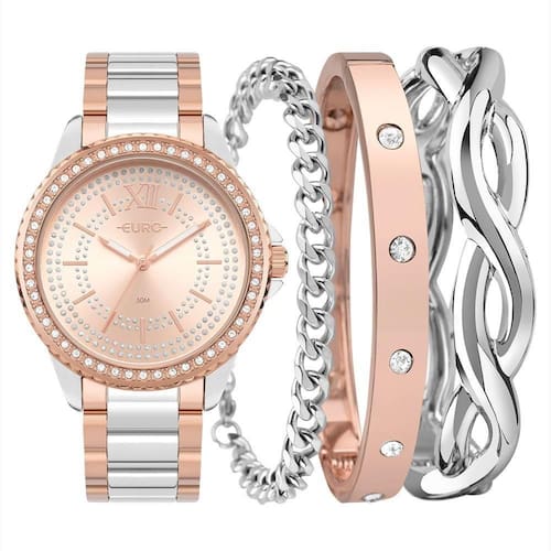 Brilhe com sofisticação! O Kit Euro Soul traz um relógio de design luxuoso com mostrador rosé e banho bicolor (prata com rosé), além de aro trabalhado com aplicação de pedras que realçam a elegância da peça. Acompanha pulseiras para compor um visual completo e glamouroso. Ideal para mulheres que gostam de se destacar com estilo e delicadeza.