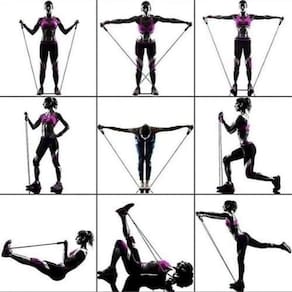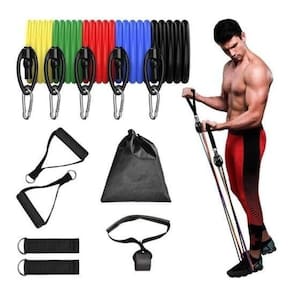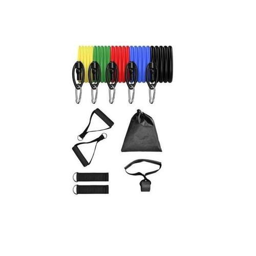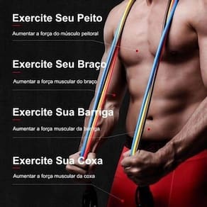 DescriçãoO kit Inclui:1 elástico amarelo de 3.0 kg de resistência1 elástico verde de 5.5 kg de resistência1 elástico vermelho de 8.0 kg de resistência1 elástico azul de 10kg de resistência1 elástico preto de 12.5 kg de resistência2 alças pegadores revestidas de espuma2 tiras para tornozelo1 âncora para colocar na porta1 bolsa em nylonAlguns benefícios dos exercícios feitos com elásticos:A execução dos movimentos exige um maior reagrupamento de fibras musculares, o que resulta na queima de boa quantidade de calorias.Como todo exercício , auxilia na melhora do sistema circulatório, reduz os níveis de stress, melhora o sono e evita a obesidade.Gera fortalecimento muscular, tanto hipertrofia quanto maior resistência, resultando em consistentes melhoras no condicionamento físico e em maior resistência contra lesões.Os praticantes têm uma significativa melhora na coordenação motora, na mobilidade e apresentam maior flexibilidade.Pode ser utilizado para tratamentos físicos pós-cirúrgicos.Especificações:Elásticos feitos de borracha profissional látex de alta qualidade e resistênciaCada elástico tem 1,20 mt de comprimentoFacilmente você pode criar mais de 30 diferentes níveis de resistência, anexando 1, 2, 3, 4 ou 5 elásticos de uma vez.Perfeito para Musculação, Yoga e Pilates etc.
