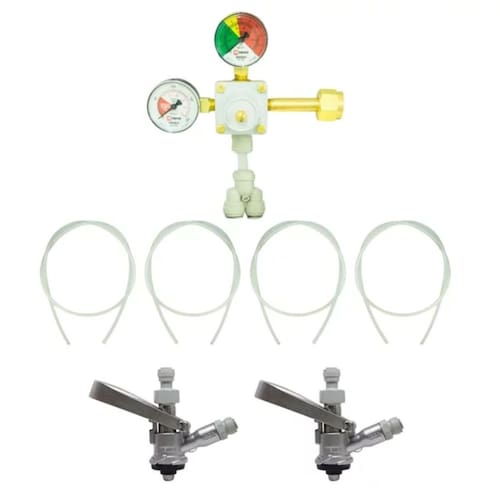 O KIT 2 Vias é composto por: 1 Válvula Redutora de Pressão com Manômetro e Engate Rápido de 2 Saídas 2 Válvulas Extratora Keg P Inox com Engate Rápido 4x (1,5m) - Tubo Polietileno 3/8 engate rápido para Chopp