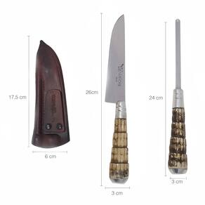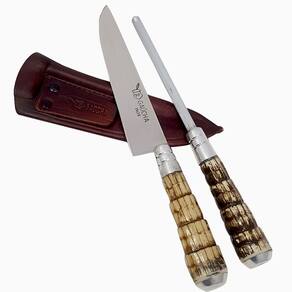 A qualidade do aço com tradição.#Excelente Acabamento#Faca Artesanal#Aço Inox 420Garantia: 90 Dias / Peso: 300g / Cor: Inox, Marrom / Ref: 4006RTConteúdo: 1 Faca 6 Polegadas, 1 Chaira e 1 Bainha de Couro Dimensões da Bainha: 17,5cm (C) x 6cm (L) x 1cm (A)Dimensões da Faca: 26cm (C) x 3cm (L) x 3cm (A) Espessura da Lâmina: 2mm / Comprimento da Lâmina: 15cmDimensões da Chaira: 24cm (C) x 3cm (L) / Aço 8mmCuidados: Guardá-la limpa e seca.Material:- Couro;- Resina: A fibra é utilizada na confecção de facas finas. Depois de manejados tornam-se peças artesanais de grande valor visual e durabilidade;- Aço Inox: Material de excelente resistência a oxidação, com tempera, possuindo grande dureza e mantendo o fio por muito tempo.