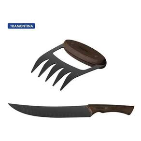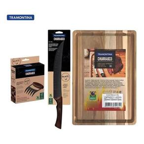 Kit Faca Churrasco Butcher,Garra Black Em Aço Inox Escurecido E Tabua Tramontina Com a faca para carne Tramontina Churrasco Black com lâmina em aço inox escurecido e cabo de madeira 10 polegadas ficou muito mais prático servir as melhores carnes no seu churrasco e com a garantia de um corte de alta qualidade. Produzida com lâmina de aço inox escurecido com excelente afiação, ela é ideal para cortes maiores. Sua lâmina conta com sulcos que minimiza o seu atrito com a carne. O cabo em madeira com rebites proporciona um manuseio muito mais firme e confortável, além de um estilo diferenciado. Escolha Tramontina e veja a praticidade tomar conta do seu dia a dia