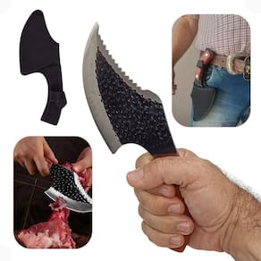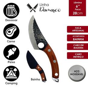 Caracteristicas: - faca fulltang lamina monobloco inteiriça estilo damasco; - formato da lâmina é único, designe arrojado; - para cortes de carne, no churrasco, na cozinha, para pesca e uso geral; - cabo anatômico proporcionando ótima pegada - furo na lâmina para indicador estabilizando mais ainda a faca; - guarda da faca ponta no final do cabo serve para quebrar vidro e com furo para passar fiel. - bainha em napa nylon com passante de cinto; - lâmina em aço inox 5cr15 possibilita uma dureza maior possibilitando uma durabilidade maior do corte. O material empregado na lâmina não enferruja. - perfeita para combate e caça - pintura fosca não reflete a luz
