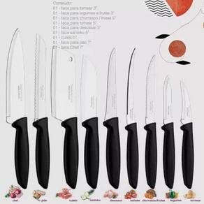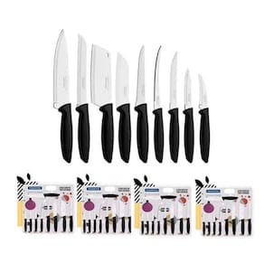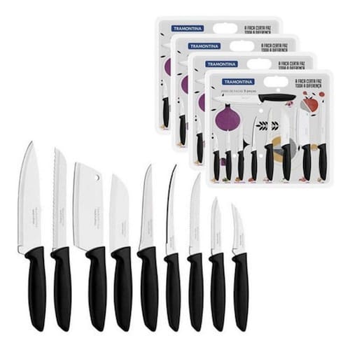 DescriçãoDistribuído por Casa das Serras**ATENÇÃO - KIT COM 4 JOGOS DE FACAS**CARACTERÍSTICAS:- Com o Jogo de Facas Tramontina Plenus com Lâminas em Aço Inox e Cabos de Polipropileno Preto 9 Peças, você terá a solução completa de facas para utilizar nos mais diversos tipos de cortes e ocasiões gastronômicas.- As peças combinam com qualquer cozinha e a deixam mais bonita e clássica, pois seus cabos são na elegante cor preta.- As lâminas produzidas em aço inox por terem sido submetidas a tratamento térmico, oferecem maior durabilidade e resistência.- Versáteis e modernos, os talheres podem compor um visual clássico, quando a opção for pelas cores sóbrias, ou alegre, se a preferência for por cores quentes e variadas.- Completa, a linha atende os diferentes usos: do preparo dos alimentos ao serviço de mesa.- A Linha Plenus vai do café da manhã ao jantar, do churrasco à mesa de queijos. As lâminas de aço inox e cabos de polipropileno são resistentes e confortáveis durante o manuseio.LIMPEZA:- Lavar com detergente neutro, esponja macia e secar imediatamente. Pode ser lavado em máquinas, não utilizar nenhum tipo de produto químico.ESPECIFICAÇÕES:Embalagem:Dimensões (CxAxL): 44,5 x 42,7 x 2,2 cmPeso: 520 gItens:Faca Chef 7"Dimensões (CxAxL): 29,9 x 1,8 x 4,7 cmPeso: 87 gFaca para Pão 7"Dimensões (CxAxL): 29,1 x 1,8 x 3,4 cmPeso: 70 gCutelo 5"Dimensões (CxAxL): 26,8 x 1,8 x 6,1 cmPeso: 130 gFaca Santoku 5"Dimensões (CxAxL): 26,8 x 1,8 x 3,8 cmPeso: 71,6 gFaca para Desossar 5"Dimensões (CxAxL): 26,2 x 1,8 x 3,4 cmPeso: 60,4 gFaca para Tomate 5"Dimensões (CxAxL): 21 x 1,4 x 2,3 cmPeso: 25,8 gFaca para Churrasco/Frutas 5"Dimensões (CxAxL): 21,8 x 1,3 x 2,1 cmPeso: 28 gFaca para Legumes e Frutas 3"Dimensões (CxAxL): 18,6 x 1,4 x 2,3 cmPeso: 25 gFaca para Tornear 3"Dimensões (CxAxL): 17,7 x 1,4 x 2,3 cmPeso: 23 gITENS QUE ACOMPANHAM:s:01 - Faca para Tornear 3"01 - Faca para Legumes e Frutas 3"01 - Faca para Churrasco/Frutas 5"01 - Faca para Tomate 5"01 - Faca para Desossar 5"01 - Faca Santoku 5"01 - Cutelo 5"01 - Faca para Pão 7"01 - Faca Chef 7"IMAGENS MERAMENTE ILUSTRATIVAS