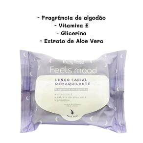 O lenço facial removedor de maquiagem da linha feels mood com fragrância de algodão. Um novo jeito super prático de remover sua make de uma forma fácil, e em poucos instantes. Você vai amar esse momento único de autocuidado que a dona ruby rose tem com você. Com sua fórmula cheia de ativos maravilhosos que além de remover sua maquiagem, atua diretamente nas partículas de sujeira deixando sua pele hidratada e rejuvenescida, amou Ainda tem, por essa você não esperava promete maciez, proteção e preserva sua elasticidade. Agora chegou a hora de inserir esse novo produto em seus cuidados diários.