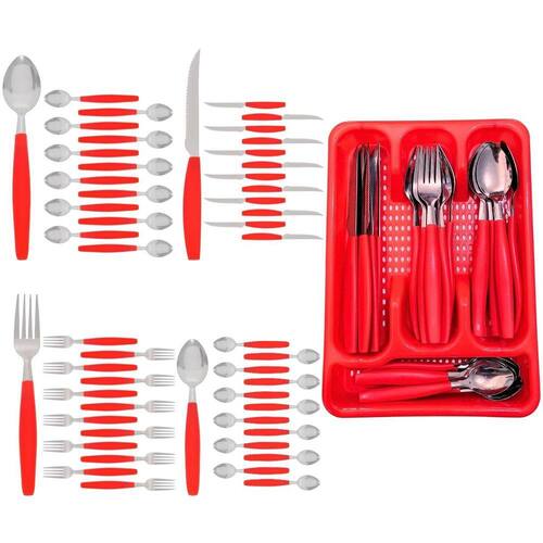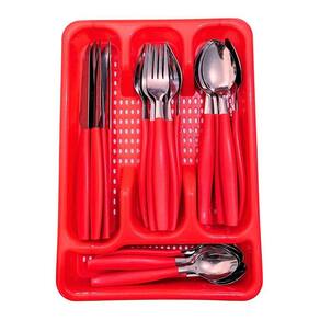 Conj de talheres + porta talher O Conjunto de talheres com porta talher é um conjunto de utensílios de mesa composto por talheres básicos, como garfos, facas, colheres e colheres de chá, acompanhados de um prático porta talheres para armazenamento e transporte conveniente. Esse conjunto é ideal para uso em casa, em viagens, acampamentos, piqueniques e outras ocasiões em que seja necessário levar os talheres consigo. Os talheres são compostos por aço inoxidável de alta qualidade e um porta talher feito de plástico durável. Os talheres são fabricados em aço inoxidável, um material conhecido por sua resistência à corrosão e durabilidade. Eles são projetados para serem resistentes e duráveis, permitindo o uso contínuo sem enferrujar ou corroer, mesmo com o contato frequente com alimentos e água.