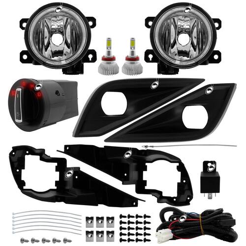 ITENS INCLUSOS: 02 - Faróis de Milha; 02 - Molduras Pretas; 02 - Bases Para Fixação da Moldura; 01 - Botão Modelo Painel; 01 - Kit Chicote Elétrico; 01 - Relê; 06 - Abraçadeiras de Plástico; 01 - PAR de Lâmpadas LED (Luz Branca) H8 ou H11; Parafusos.