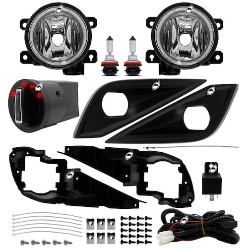 ITENS INCLUSOS: 02 - Faróis de Milha; 02 - Molduras Pretas; 02 - Bases Para Fixação da Moldura; 01 - Botão Modelo Painel; 01 - Kit Chicote Elétrico; 01 - Relê; 06 - Abraçadeiras de Plástico; 01 - PAR de Lâmpadas Halogenas (Luz Amarela) H8; Parafusos.