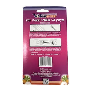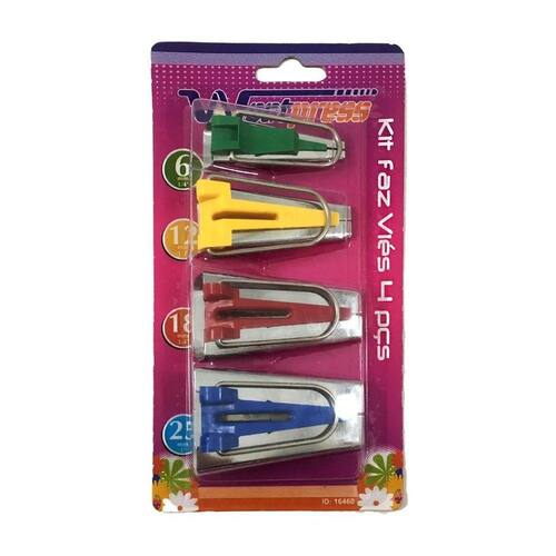 Informações gerais ------------------------------------ Kit com 4 aparelhos Para fazer viés manualmente Faça o seu próprio viés em minutos, crie com as cores e estampas que você preferir. Rápido, prático e preciso Tamanhos 6 mm; 12 mm; 18 mm; 25 mm