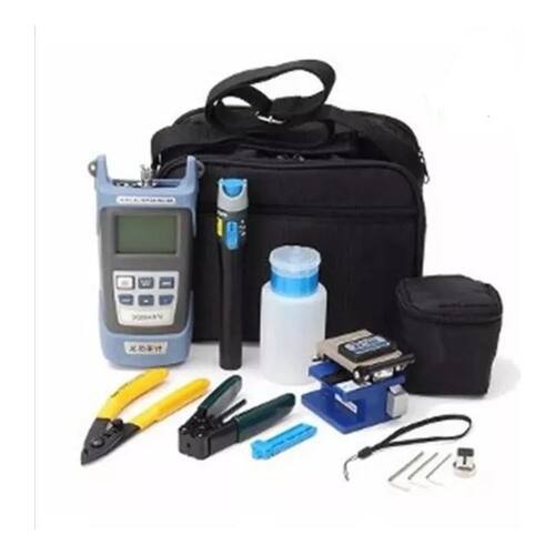 O kit inclui um cortador de fibra óptica, um decapador de cabos, uma tesoura de precisão, um clivador de fibra óptica, um identificador de fibra óptica, um medidor de potência óptica, um localizador visual de falhas, um conector rápido de fibra óptica e uma caixa de ferramentas para armazenamento.