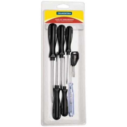 Jogo de Chaves de Fenda Tramontina 7 Peças, que traz chaves de fenda com ponta cruzada e ponta chata, além de uma chave teste. Uma combinação ideal entre praticidade, resistência e versatilidade, principalmente por acompanhar uma chave teste que pode ser utilizada para verificar a presença de corrente elétrica e previnir acidentes. É, sem dúvida alguma, item obrigatório em seu kit de ferramentas!
