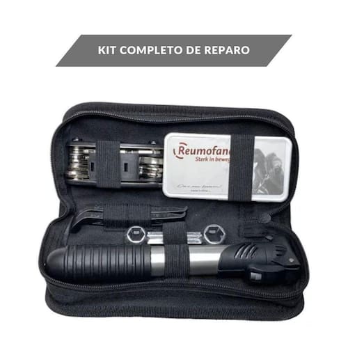 - Bomba de ar com adaptador para bico - Kit Reparo Para Os Pneus - Alavancas de remoção de pneus - Estojo com compartimentos de separação das ferramentas Dimensões aproximadas 22x10x5cm