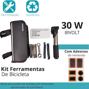Descrição do anúncio: Prepare-se para aventuras sem preocupações com o bolsa kit de ferramentas para bicicleta. Este kit completo e compacto é essencial para ciclistas que valorizam a preparação e segurança durante seus passeios. Com uma variedade de ferramentas essenciais, você estará pronto para resolver qualquer contratempo rapidamente e continuar sua jornada sem interrupções. Conteúdo da embalagem: O kit inclui: Bolsa resistente para quadro de bicicleta com chaves multifunções fenda, philips, allen Soquete sextavado 8 / 9 / 10mm Chave de boca 8 / 10 / 15mm Bomba de ar em alumínio com adaptador para bico Kit reparo de pneus 8 reparos, cola, lixa e manual de instrução Espátulas alavancas de remoção de pneu Estojo protetor dimensões aproximadas 22x10x6cm Características: Bolsa prática e resistente para transporte seguro das ferramentas. Kit completo para reparos rápidos na bicicleta, incluindo chaves, bomba de ar, remendos de pneu e mais. Ferramentas de alta qualidade e durabilidade, garantindo desempenho confiável. Espaço organizado na bolsa para fácil acesso e armazenamento das ferramentas. Especificações: Bolsa para quadro de bicicleta com dimensões aproximadas de 22x10x6cm. Material das ferramentas: metal duro aço inox para chaves . Bomba de ar em alumínio com adaptador para bico fino e normal. Espátulas alavancas de remoção de pneu são de plástico resistente. Principais perguntas sobre o produto e respostas: 1 a bomba pode ser utilizada no bico fino e normal - sim, acompanha um adaptador para a bomba. 2 as espátulas são de plástico ou alumínio - são de plástico. 3 o metal da chave é frágil - as chaves são de metal duro, aço inox, podendo ser usadas diversas vezes sem deformidades. Marca: Não Informado