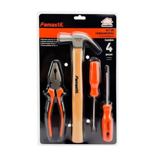 Sobre este item: Ideal para Carpintaria 1 Martelo Unha 21 mm 1 Alicate Universal 6" 1 Chave de Fenda 3/16 x 4" 1 Chave Philips 3/16 x 4" Contém 4 itens