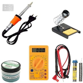 Kit Ferro De Solda Multímetro Suporte Pasta Tubete 40w 220v ATENÇÃO ESCOLHA A VOLTAGEM E O WATTS NO CAMPO DE OPÇÕES! Kit composto por 5 produtos 1* Ferro de SoldaO Ferro de solda é indicado para soldagem de componentes eletrônicos e de outros pequenos reparos.Com rápido aquecimento e manutenção da temperatura, proporciona maior produtividade na utilização.- Potência: Escolher as opções disponíveis.- Tensão: escolher as opções disponíveis. 2* Solda estanho em tuboO estanho para solda em tubo é de fácil utilização, vem em fio de 1 mm com fluxo interno que ajuda na aderência e soldagem.Para pequenos reparos em elétrica, eletrônica, instalação de CFTV, alarmes e outros, seja hobby ou .Apropriado para pequenos reparos por meio de ferro de solda. 3* Pasta para solda 110mgA pasta para soldar 110g é um produto que tem como finalidade garantir o contato elétrico entre as partes que serão soldadas e garantir resistência mecânica. O não uso deste produto pode tornar difícil o processo de soldagem, pois a solda pode escorrer ou grudar em locais onde não deveria. 4* Multímetro digital DT830 Modelo compacto O multímetro digital compacto apresenta resposta rápida, com tela lcd de fácil leitura, leve e portátil, que é muito adequado para uso na escola, em casa, na fábrica e para profissionais e amadores. 5* Suporte de Ferro de Solda com esponja vegetalSuporte de ferro de solda com esponja vegetal, traz para o de eletrônica uma solução simples e eficaz para o repouso do seu ferro de solda. Com o tamanho do bocal superior a 40mm de diâmetro, ele pode ser utilizado com a maioria dos ferros de solda convencional, tornando assim seu trabalho muito mais rápido e .