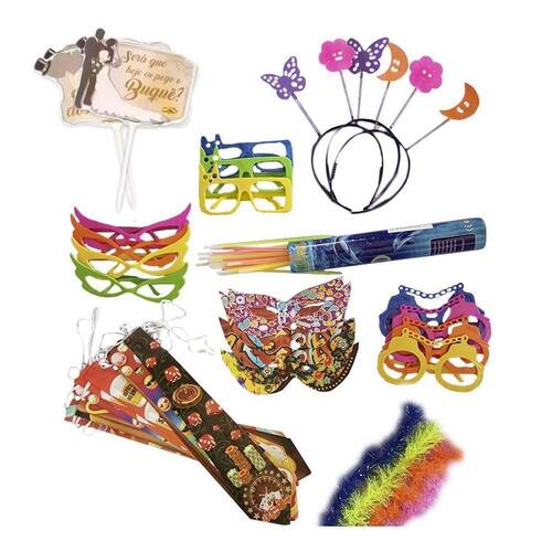 Conteúdo: 1 Tubo de Pulseiras Neon com 50 Pulseiras, 10 Marabus Coloridos, 3 Pacotes de Tiaras Cítricas com 10 unidades cada, 3 Pacotes Óculos de Festa de acordo com o estoque com 10 unidades cada, 1 Pacote de Plaquinhas Divertidas de Casamento com 10 Unidades, 1 Pacote de Máscara Gatinha com 10 Unidades, 1 Pacote de Gravata com 10 Unidades;