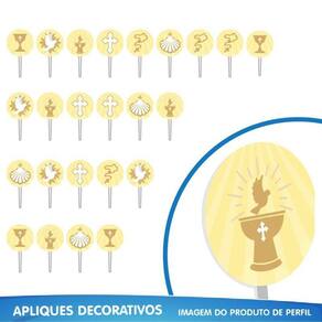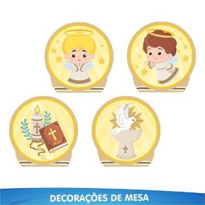 Esse kit completo inclui desde enfeites para a mesa até toppers para o bolo do batizado, oferecendo tudo o que você precisa para criar um ambiente tocante e memorável. São 06 enfeites para mesa, 07 toppers para bolo, 24 apliques decorativos de alta definição em EVA, 01 faixa Feliz Batizado em EVA glitter com uma fita de cetim refinada e 04 quadros temáticos em EVA.