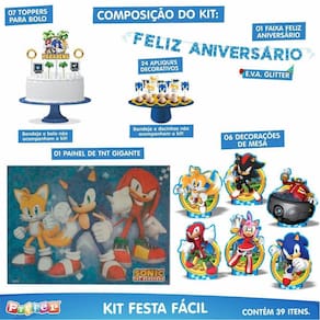Kit festa sonic 39 itens painel + faixa + enfeites + topo Kit festa fácil tema sonic - produto original e licenciado