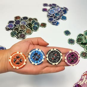 As fichas são produzidas em ABS com núcleo metálico, oferecendo peso equilibrado de 11g e sensação a cada jogada. Além disso, o kit conta com fichas adicionais de PVC e dados, ampliando as opções de diversão para diferentes tipos de jogos de apostas.