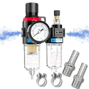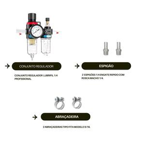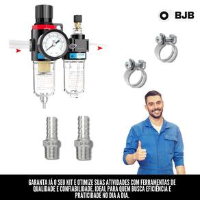 Kit Filtro com Conectores para Compressores de ar Características: Alta Precisão: Regulador com manômetro integrado para leitura precisa da pressão de saída, garantindo um controle eficiente do fluxo de ar.Filtragem Eficiente: Sistema de filtragem que remove partículas e umidade, protegendo suas ferramentas pneumáticas e aumentando sua durabilidade.Ajuste Fácil: Botão de ajuste ergonômico para fácil regulagem da pressão conforme a necessidade.Especificações Técnicas: Modelo: AFR-2000Faixa : 0-1.0 MPaMaterial: Corpo em alumínio de alta resistência com copos em policarbonato para visualização clara do nível de filtragem.Conexões: Rosca padrão compatível com a maioria dos compressores e ferramentas pneumáticas.Aplicações: Uso Industrial e Doméstico: Ideal para sistemas de ar comprimido em oficinas, fábricas e também para entusiastas do faça-você-mesmo.Proteção de Ferramentas: Mantém o ar limpo e seco, prolongando a vida útil de ferramentas pneumáticas e sistemas de ar comprimido.Vantagens: Durabilidade: Construção robusta que garante longa vida útil mesmo em ambientes de trabalho exigentes.Eficiência: Melhora a performance das ferramentas pneumáticas ao fornecer ar limpo e seco, reduzindo a manutenção e o desgaste.Incluso na Embalagem: 1 Regulador com Manômetro AFR-20002 Conectores de Engate Rápido2 Abraçadeiras de FixaçãoGarantia: Confiabilidade: do vendedor de 3 meses contra defeitos de fabricação.Adquira já este kit completo de regulador com manômetro e conectores, e garanta a eficiência e a longevidade das suas ferramentas pneumáticas. Ideal para quem busca qualidade e precisão em suas atividades diárias Marca: Não Informado Ean: 7891686783393