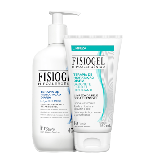 Kit com sabonete líquido e loção hidratante corporal para peles secas e sensíveis. O Kit Fisiogel Terapia de Hidratação Diária promove uma limpeza e hidratação intensa no corpo e no rosto, além de ajudar na recuperação da umectação e da suavidade cutânea do corpo, com resultados logo na primeira aplicação.