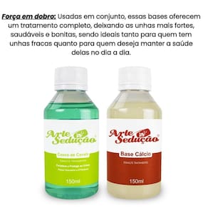 Contém: 01 - Esmalte de Tratamento Casco de Cavalo, 150ml, Arte Sedução; 01 - Esmalte de Tratamento Base Cálcio, 150ml, Arte Sedução.
