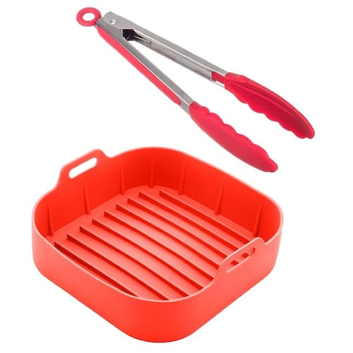 Forma de silicone super flexível para Air Fryer, com relevo para circulação de ar, formato quadrado, antiaderente, livre de BPA, suporta temperaturas de -40ºC a 240ºC, pode ser utilizada em micro-ondas, forno, freezer e Air Fryer, pode ir na lava louças. Pegador resistente ao calor para manuseio seguro de alimentos.Tipo