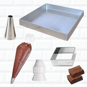 Forma brownie 25x25x3 cm Cortador quadrado n 3 5x4 cm inox Bico liso nº2 - 2,9 x 6 x 0,7 cm Manga descartável 6 unid. Adaptador