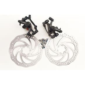 Maior poder de frenagem com baixo custo, leve e resistente... O Freio a disco Absolute possui acionamento por cabos de aço (mecânico), oferece ótimo poder de frenagem, acompanha par de discos (rotores) de 160mm, e pinças completas em alumínio com pastilhas já inclusas, formando um kit leve e resistente. Principais Características - Produto NOVO e na CAIXA - Marca: Absolute - Pinças / Caliper / Burrinho Completo em alumínio e com pastilhas já inclusas - Discos (rotores) de 160mm com 6 Furos - Peso aproximado 380g Componentes - 2x Pinças de Freio Mecânico Absolute com pastilhas - 2x Discos (rotores) de 160mm com 6 furos - 12 Parafusos de fixação dos discos (rotores) - 04 Parafusos de fixação das pinças Não acompanha cubos