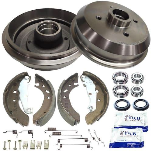 Conteúdo : 02 - tambores cubo fixo panela/campana 02 - rolamentos internos 02 - rolamentos externos 02 - retentores 01 - jogo de sapatas com lona 01 - jogo de molas da sapata