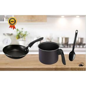 Kit frigideira e canecão fervedor leiteira antiaderente teflon com espatula cor grafite Kit fervedor e frigideira antiaderente Teflon com cabo de baquelite é ideal para facilitar o preparo de alimentos na cozinha. O fervedor ideal para ferver água leite chás de forma rápida e prática, enquanto a frigideira antiaderente permite preparar alimentos com facilidade, sem grudar no fundo.