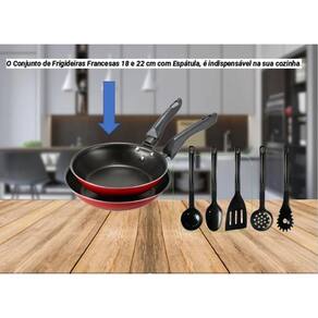 Kit Frigideira Francesa 18 E 22 cm + 5 Talheres Antiaderente O Kit Frigideira Francesa da ALUMETAL é composto por 2 frigideiras + talheres nylon. Elas contam com um design moderno e prático, possui revestimento antiaderente, assim seus alimentos não grudam, facilitando a limpeza e reduzindo o uso de gordura. Além disso, seu cabo antitérmico garante segurança no manuseio e proteção contra calor. Proporcionando praticidade, beleza e elegância na sua cozinha Produzida com materiais especiais e a mais alta tecnologia do mercado, garantindo durabilidade e qualidade ao produto. Material muito resistente e fácil de limpar. Apresenta tamanho excelente para o preparo das suas refeições. Conta com revestimento antiaderente, garantindo que os alimentos não grudem O cabo antitérmico garante segurança no manuseio e proteção contra calor. Especificações Técnicas:
